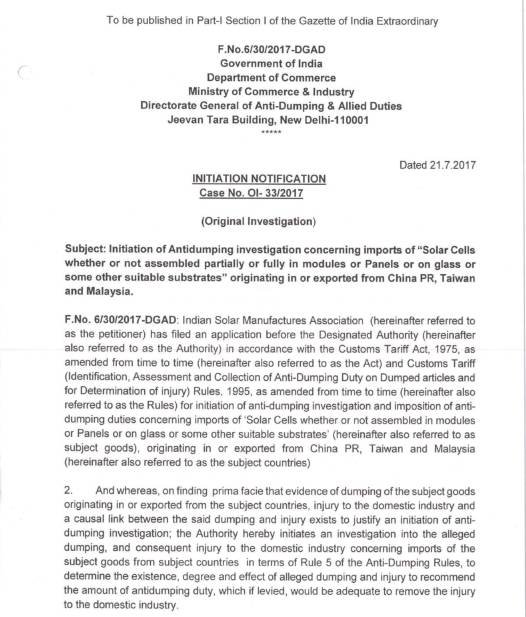 2017年7月21日,印度商工部反傾銷局發(fā)布公告,稱應(yīng)其國(guó)內(nèi)產(chǎn)業(yè)申請(qǐng),決定對(duì)自中國(guó)大陸、中國(guó)臺(tái)灣和馬來(lái)西亞進(jìn)口的光伏電池及組件發(fā)起反傾銷調(diào)查。根據(jù)該文件原文,印度此次發(fā)起的反傾銷是針對(duì)中國(guó)、臺(tái)灣、馬來(lái)西亞