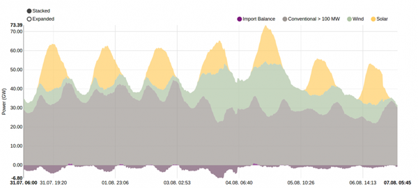 如上圖所示,可以觀察到最近一周德國(guó)的用電來(lái)源分布。
