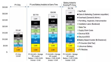 我們發(fā)現(xiàn),使用5.6千瓦太陽能光伏板和3千瓦/6千瓦時鋰離子電池的小型電池案例的基準價格大約是單一的與電網(wǎng)相連的5.6千瓦太陽能光伏系統(tǒng)的2倍(詳情請參考圖1)。對新裝太陽能光伏+儲能系統(tǒng)而言,直流系統(tǒng)的價格(27,703美元)比交流系統(tǒng)的價格(29,568美元)低1,865美元。交流系統(tǒng)的價格溢價主要是由于交流配置所需的額外并網(wǎng)換流器造成的硬件和人工成本。然而,在對比交流與直流系統(tǒng)時,安裝價格并不是唯一的考慮因素:交流系統(tǒng)在光伏能源即發(fā)即用的應用中效率更高,而直流系統(tǒng)則在光伏能源儲存儲的應用中更有效率。