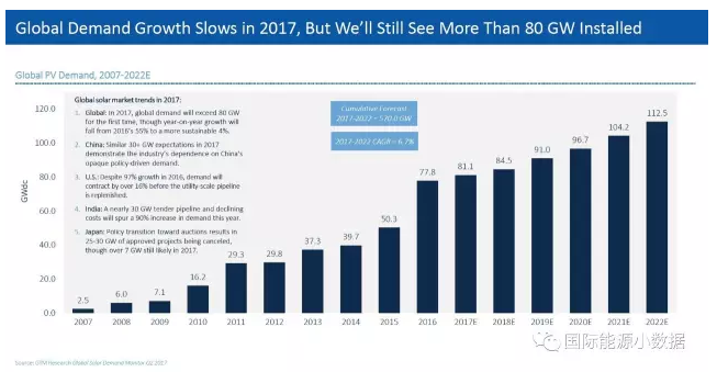根據(jù)GTMResearch咨詢公司最新評估,2017年全球光伏增速放緩,與2016年相比增長僅為4%(2016年比上一年增長55%),新增裝機將達到81吉瓦(其中中國新增裝機超過30吉瓦)。