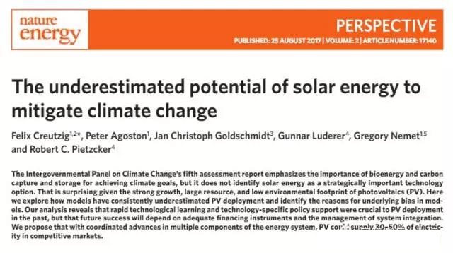 德國(guó)研究人員在最近一期《自然˙能源》雜志上發(fā)表題為T(mén)heunderestimatedpotentialofsolarenergytomitigateclimatechange(太陽(yáng)能減緩氣候變化的潛力被低估)。在這篇文章中展示了下面的曲線(xiàn)圖:從上圖可見(jiàn),國(guó)際