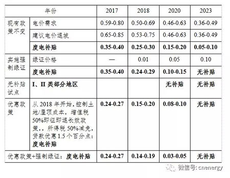 2020年新建項目度電補貼強度可以2017年基礎上降低0.2元/千瓦時左右,達到0.15-0.20元/千瓦時,2023年度電補貼強度可以2020年基礎上再降低0.1元/千瓦時左右,補度電貼強度普遍在0.1元/千瓦時以內(nèi)。