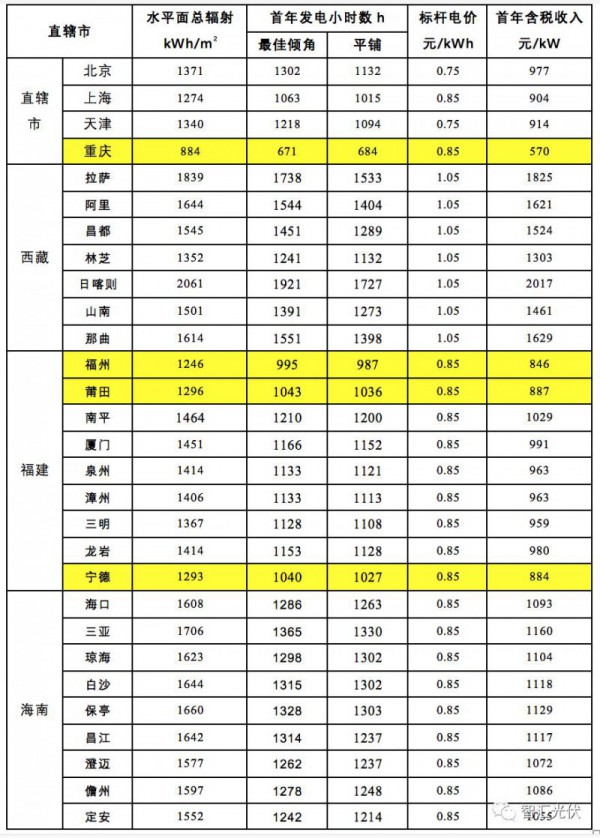 從表2可以看出,除重慶、福建的福州、莆田寧德之外,其他地方的太陽(yáng)能資源在現(xiàn)有電價(jià)水平下,都能有相對(duì)較好的收益。