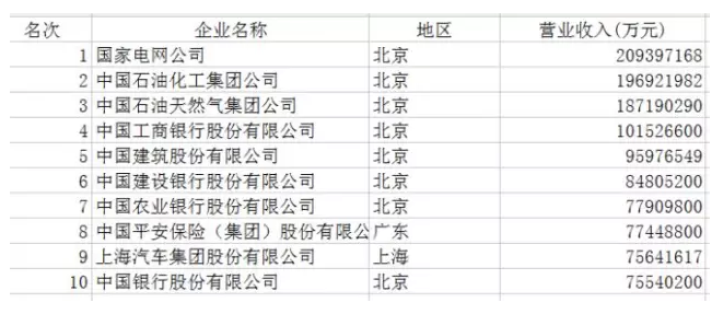 2017中國企業(yè)500強(qiáng)的營業(yè)收入總額首次突破60萬億元,達(dá)到了64.00萬億元,相當(dāng)于去年我國GDP總額的86%。榜單上,營業(yè)收入超過1000億元的共有157家,較上年增加5家,繼續(xù)擴(kuò)容。其中,國家電網(wǎng)公司成為中國唯一營業(yè)收入超過2萬億元的企業(yè),僅次于美國沃爾瑪,是世界第二大企業(yè)。