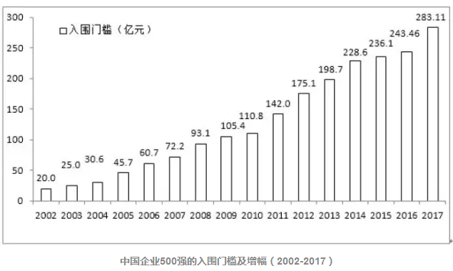 2017中國企業(yè)500強(qiáng)的入圍門檻為營業(yè)收入283.11億元,達(dá)到歷史新高,較上年大幅提高了39.65億元,提高幅度是自2002年發(fā)布中國企業(yè)500強(qiáng)以來以來最大的。