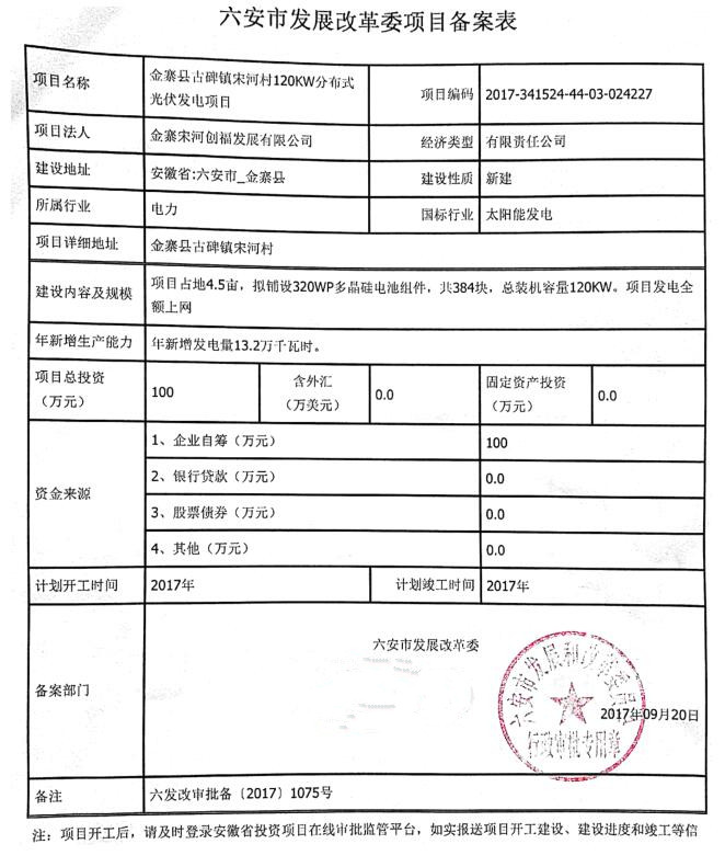金寨縣古碑鎮(zhèn)宋河村光伏電站備案