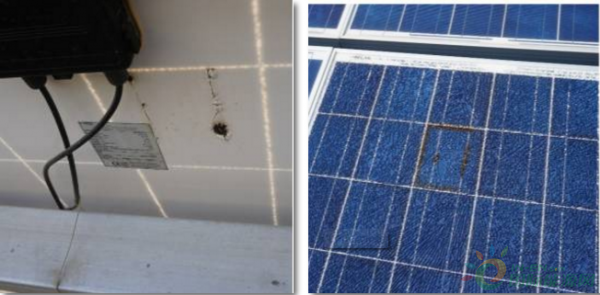 在一期10MW光伏電站中使用PVDF背板的組件出現(xiàn)了正面玻璃破裂,PVDF背板灼燒開裂的現(xiàn)象。背板開裂除了影響組件的發(fā)電效率以及生命周期之外,更需要注意的是這意味著組件存在漏電等安全風(fēng)險,無疑增大了投資企業(yè)的潛在風(fēng)險。