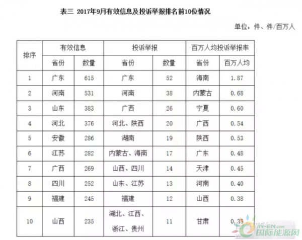 2017年9月,各?。ㄗ灾螀^(qū)、直轄市)按照有效信息數(shù)量排序,廣東、河南、山東等省列全國前10位;按照投訴舉報數(shù)量排序,廣東、河南、廣西等省排在全國前10位;按照百萬人均投訴舉報率排序,海南、內(nèi)蒙古、寧夏等省位于全國前10位。(2017年9月有效信息及投訴舉報排名前10位情況見表三)