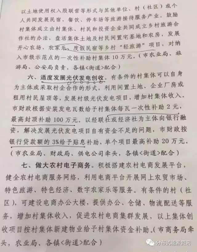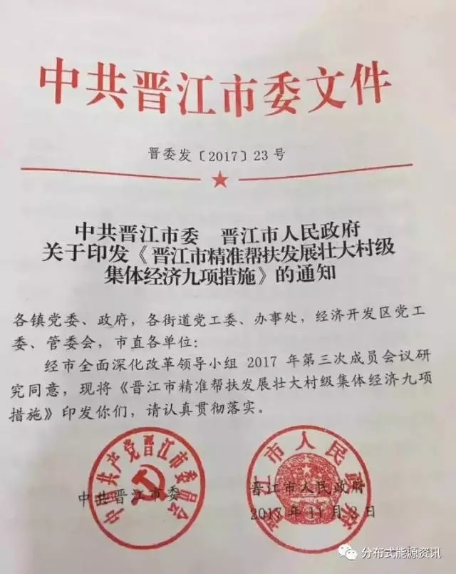 近日,福建省晉江市委、市政府聯(lián)合發(fā)布《晉江市精準(zhǔn)幫扶發(fā)展壯大村級(jí)集體經(jīng)濟(jì)九項(xiàng)措施》的文件,對(duì)晉江市光伏發(fā)電實(shí)行補(bǔ)助,村級(jí)光伏項(xiàng)目一次性補(bǔ)助2元 瓦,對(duì)于貸款部分,市級(jí)財(cái)政給予3%的貼息補(bǔ)助。
