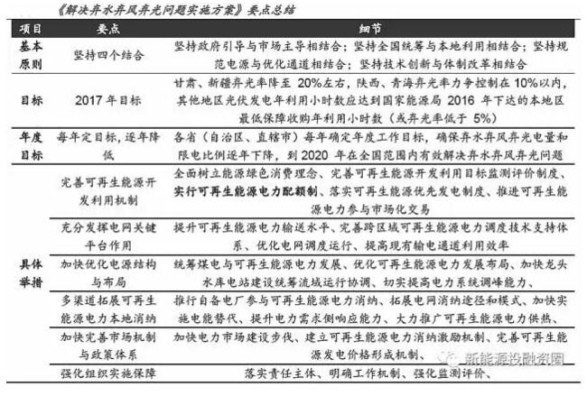 《解決棄水棄風棄光問題實施方案》發(fā)布。2017年11月13日,國家能源局、國家發(fā)改委正式下發(fā)《解決棄水棄風棄光問題實施方案》(以下簡稱《方案》),明確按年度實施可再生能源電力配額制,并在2020年全國范圍內(nèi)有效解決棄水棄風棄光問題。方案共13頁,內(nèi)容達27條之多,解決“三棄”(棄水棄風棄光)問題的難度可見一斑。我們認為《方案》主要有以下三個亮點:(1)制定了2017年的目標,并提出各地要逐年下調(diào)目標,以在2020年全國范圍內(nèi)有效解決“三棄”問題;(2)明確按年度實施可再生能源電力配額制,并明確了配額的考核主體;(3)再次重申解決“三棄”問題的重要性。