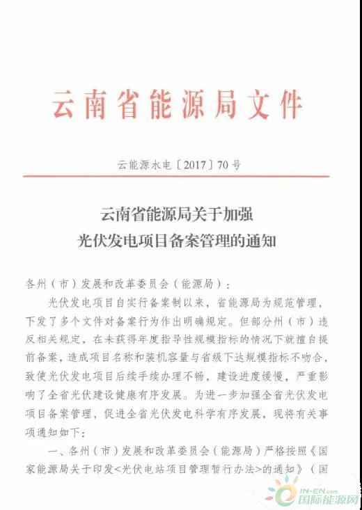 云南:關(guān)于加強光伏發(fā)電項目備案管理的通知(云能源水電〔2017〕70號)文件