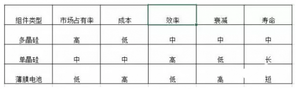 上圖是一個(gè)光伏電站系統(tǒng)拓?fù)鋱D,可以看到一個(gè)光伏電站應(yīng)該包含哪些設(shè)備,光伏組件、匯流箱、逆變器、光伏支架、電纜、箱變(戶用光伏項(xiàng)目不用),一個(gè)電站設(shè)備上大概是這么多,而這些設(shè)備中,組件的成本更是占總投資成本的一半以上,故對(duì)光伏組件的選擇和甄別是非常重要的。市場上主流的光伏組件有三種類型,分別是多晶硅、單晶硅、薄膜電池,各有千秋。