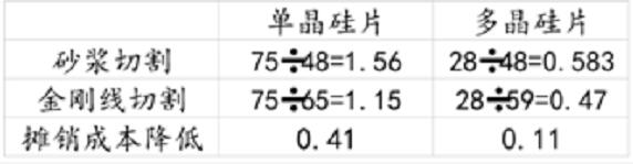 通過上表數(shù)據(jù)可知:金剛切出片量的提升使得單晶硅片長晶環(huán)節(jié)攤銷成本降低0.41元,而對(duì)于多晶硅片攤銷成本只降低了0.11元。出片量的提升對(duì)于單晶硅片的降本更為顯著。