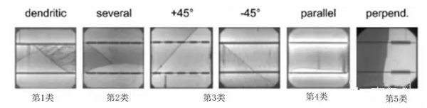 2011年,德國ISFH公布了他們的研究結果:根據(jù)電池片隱裂的形狀,可分為5類:樹狀裂紋、綜合型裂紋、斜裂紋、平行于主柵線、垂直于柵線和貫穿整個電池片的裂紋。