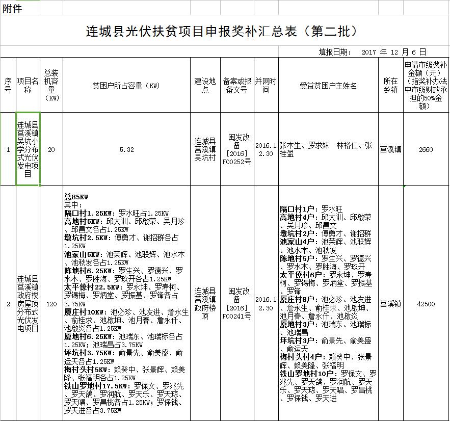 附件:連城縣光伏扶貧項目申報獎補匯總表(第二批)