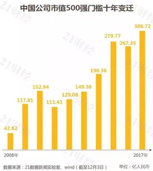 而進(jìn)入500強(qiáng)的市值門檻,從2008年12月的42.62億到最新的306.72億,劇增了6倍之多,明顯跑贏中國上市公司的增長速度。