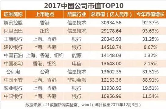 截至2017年12月1日,占據(jù)500強(qiáng)前兩位的騰訊控股、阿里巴巴總市值分別為30935億、29179億,差不多高出第三名工商銀行50%。