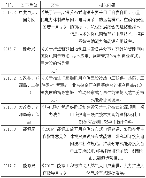 從2015年開始,隨著天然氣價格改革推進(jìn)、技術(shù)條件趨于成熟、環(huán)保節(jié)能議題愈發(fā)重要,國家開始集中出臺政策,大力推動分布式能源的發(fā)展。“十三五”規(guī)劃支持天然氣分布式能源發(fā)展,鼓勵發(fā)展天然氣調(diào)峰發(fā)電和冷熱電三聯(lián)供。