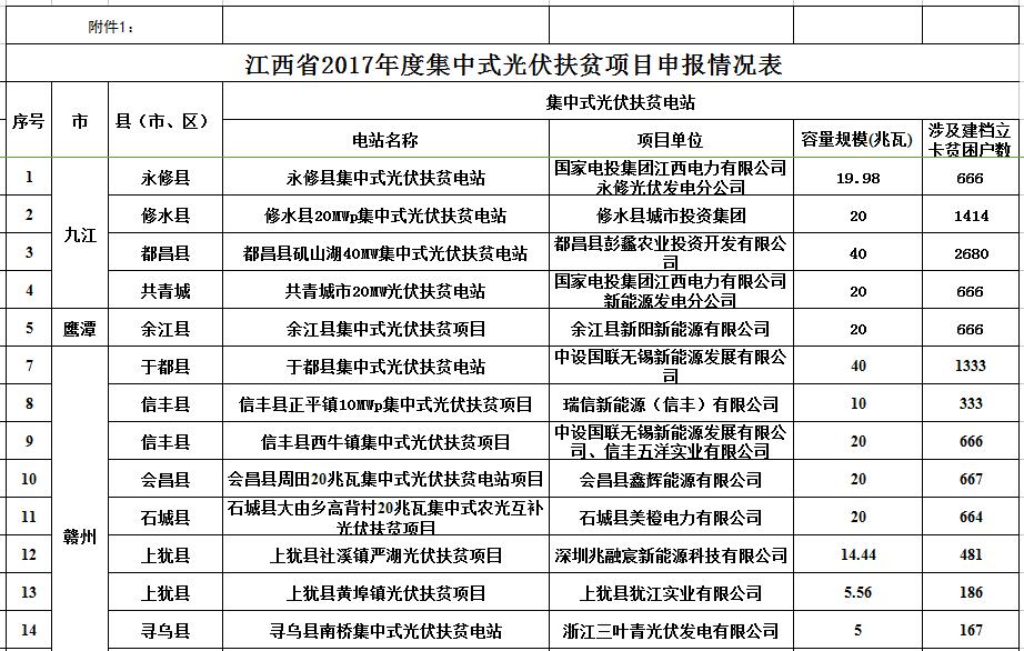 為用好、用足國(guó)家政策,做好集中式光伏扶貧電站項(xiàng)目申報(bào)工作和建設(shè)規(guī)模配置工作,江西省發(fā)展和改革委員會(huì)、江西省扶貧和移民辦公室印發(fā)了《關(guān)于開(kāi)展2017年度集中式光伏扶貧項(xiàng)目申報(bào)工作的通知》(贛發(fā)改能源[2017]1