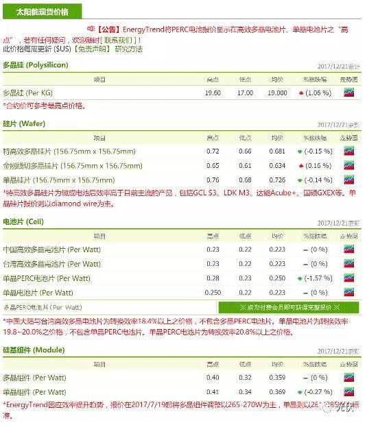 12月21日,EnergyTrend發(fā)布最新光伏產(chǎn)業(yè)鏈價格,多晶硅均價146元 公斤仍然堅挺,長單鎖定市場交易量少;金剛線多晶片均價4 9元 片,供不應(yīng)求價格續(xù)漲,180μm單晶硅片均價5 6元 片止跌;PERC單晶電池均價1 93元