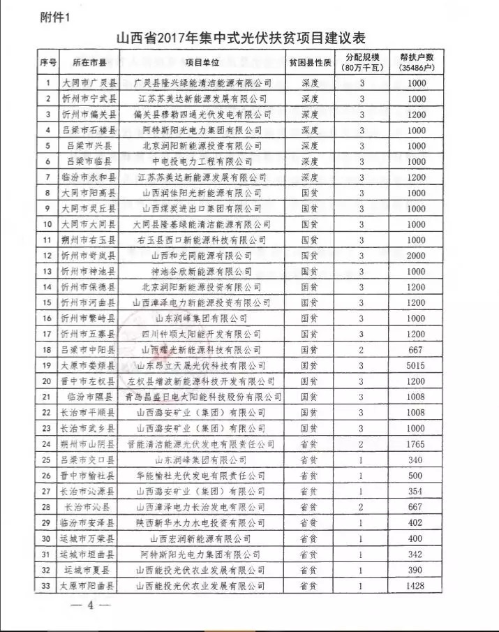山西2017年800MW集中式光伏扶貧指標分配項目名單