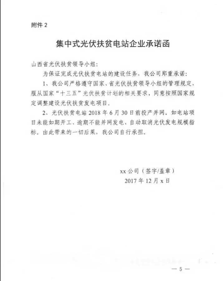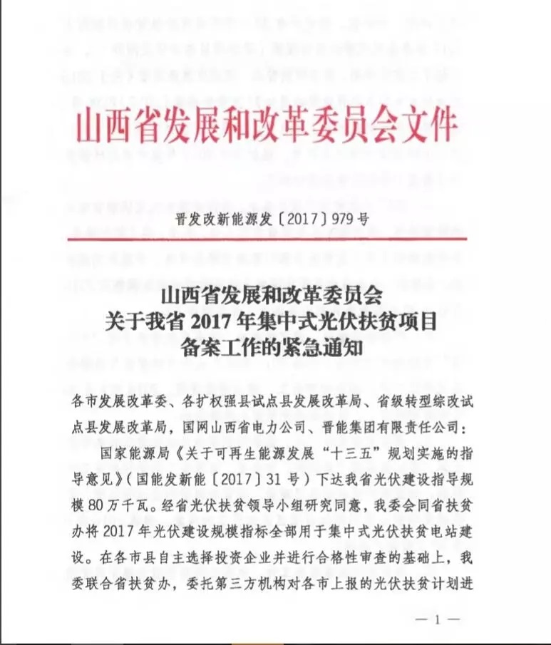 12月26日,山西省發(fā)改委印發(fā)了《關(guān)于我省2017年集中式光伏扶貧項目備案工作的緊急通知》,要求全省33個集中式光伏扶貧項目要在2017年底前完成項目備案。未按期開工、建設(shè)進度緩慢、2018年6月30日未并網(wǎng)的項目,自