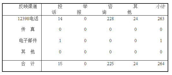 按反映渠道分類,12398電話263件,電子郵件1件。(2017年11月收到有效信息情況見表一)