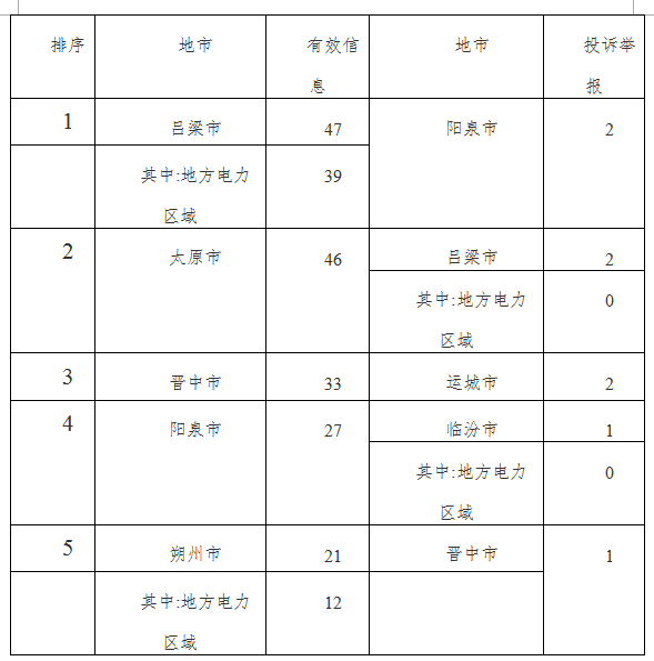 各地市按照收到的有效信息數(shù)量排序,呂梁市、太原市、晉中市、陽泉市、朔州市等列轄區(qū)內(nèi)前5位;按照投訴舉報數(shù)量排序,陽泉市、呂梁市、運城市、臨汾市、晉中市等排在轄區(qū)內(nèi)前5位。(2017年11月有效信息及投訴舉報排名前5位情況見表三)