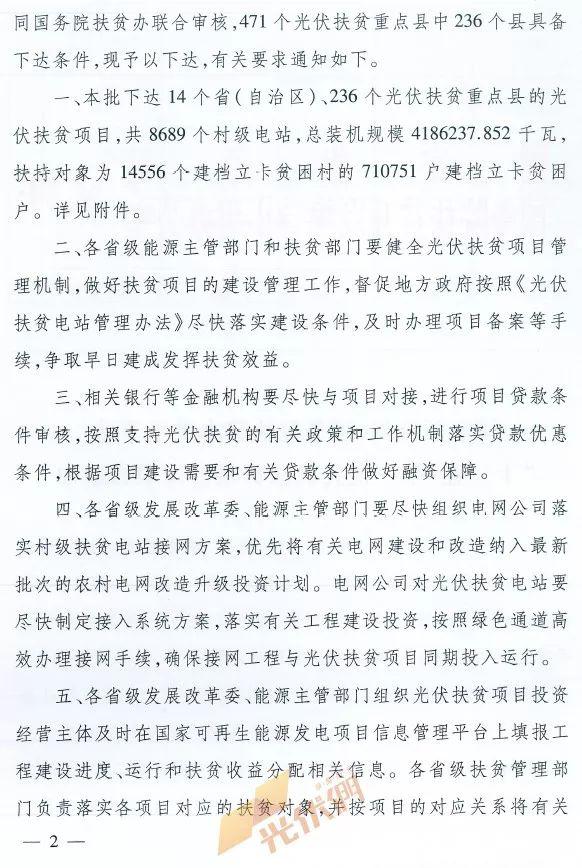 隨著扶貧攻堅(jiān)戰(zhàn)進(jìn)入關(guān)鍵階段,近日國(guó)家能源局、國(guó)務(wù)院扶貧開發(fā)領(lǐng)導(dǎo)小組辦公室聯(lián)合發(fā)布《關(guān)于下達(dá)“十三五”第一批光伏扶貧項(xiàng)目計(jì)劃的通知》,經(jīng)過(guò)國(guó)家能源局、國(guó)務(wù)院扶貧辦及相關(guān)單位數(shù)月的辛苦審核,涉及14個(gè)省(自治區(qū))、236個(gè)光伏扶貧重點(diǎn)縣的總規(guī)模4186.237852MW的光伏扶貧項(xiàng)目獲得批準(zhǔn),面向的扶貧對(duì)象為14556個(gè)建檔立卡貧困村的71.0751萬(wàn)戶建檔立卡貧困戶。