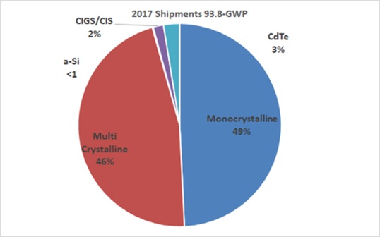 根據(jù)該報(bào)告,2017年太陽(yáng)能電池(發(fā)電組件)的生產(chǎn)量為97.7GW,其中出貨量為93.8GW,其安裝容量為95.1GW。根據(jù)組件類(lèi)型的占有率分析,在93.8GW的出貨量中,單結(jié)晶硅型的市場(chǎng)占有率為49%,多晶體硅型為46%,化合物型的鎘碲(CDTE)類(lèi)型為3%(圖1)。