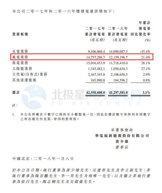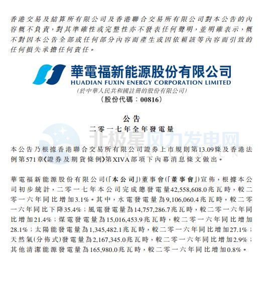 華電福新2017年風(fēng)電發(fā)電量147.6億千瓦時 同比增長21.4%