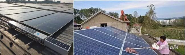 灰塵和污染產生的降額也是不能忽視的,在一些降雨少且污染嚴重的地方,灰塵遮擋導致的功率損失是相當大的,需要定期進行組件清洗,目前已經有組件清掃機器人面世(上圖左),可見組件清洗的重要性。