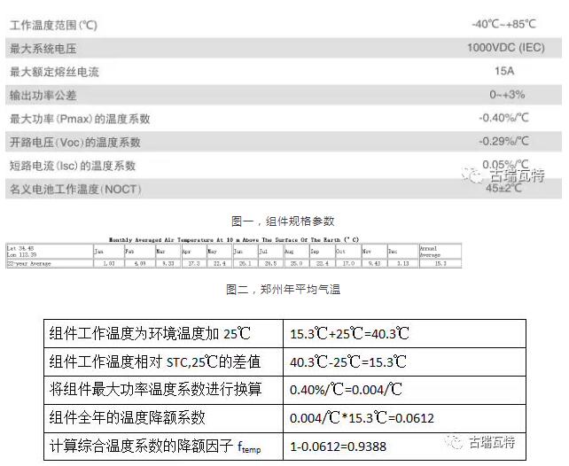 組件使用晶科280W組件,組件最大功率溫度系數為-0.40%/℃,從NASA的數據庫可查詢到河南鄭州年平均環(huán)境溫度為15.3℃。