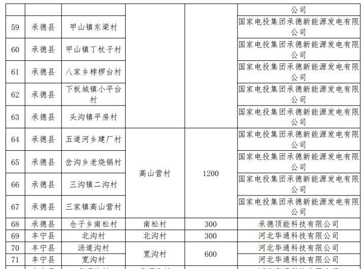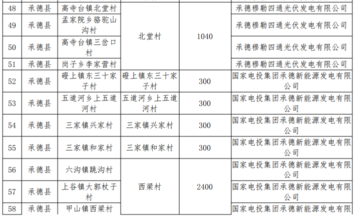 五、同意承德縣村級(jí)光伏扶貧電站建設(shè)企業(yè)由承德穆勒四通光伏發(fā)電有限公司變更為承德穆勒四通光伏發(fā)電有限公司、國(guó)家電投集團(tuán)承德新能源發(fā)電有限公司、承德頂能科技有限公司3家企業(yè)。同意劉杖子鄉(xiāng)小西營(yíng)村、南大洼村、孟家莊村、鞍匠鎮(zhèn)后溝村4個(gè)村級(jí)光伏扶貧電站項(xiàng)目變更為高寺臺(tái)鎮(zhèn)北堂村、三家鎮(zhèn)高山營(yíng)村、三家鎮(zhèn)興家村、五道河鄉(xiāng)上五道河村4個(gè)村級(jí)光伏扶貧電站項(xiàng)目,建設(shè)地點(diǎn)位于本村,規(guī)模不變;孟家院鄉(xiāng)駱駝山溝村、高寺臺(tái)鎮(zhèn)三岔口村、崗子鄉(xiāng)李家營(yíng)村與高寺臺(tái)鎮(zhèn)北堂村采取4村聯(lián)建、分村備案的方式,建設(shè)地點(diǎn)變更為高寺臺(tái)鎮(zhèn)北堂村,裝機(jī)規(guī)模1040千瓦;五道河鄉(xiāng)建廠村、岔溝鄉(xiāng)老燒鍋村、三溝鎮(zhèn)二溝村與三家鎮(zhèn)高山營(yíng)村采取4村聯(lián)建、分村備案的方式,建設(shè)地點(diǎn)變更為三家鎮(zhèn)高山營(yíng)村,裝機(jī)規(guī)模1200千瓦。六溝鎮(zhèn)跳溝村、上谷鎮(zhèn)大郭杖子村、甲山鎮(zhèn)東梁村、甲山鎮(zhèn)丁杖子村、八家鄉(xiāng)桲欏臺(tái)村、下板城鎮(zhèn)小平臺(tái)村、頭溝鎮(zhèn)平房村與甲山鎮(zhèn)西梁村采取8村聯(lián)建、分村備案的方式,建設(shè)地點(diǎn)變更為甲山鎮(zhèn)西梁村,裝機(jī)規(guī)模2400千瓦。