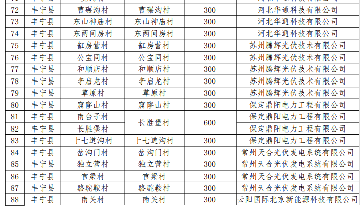 六、同意豐寧滿族自治縣村級(jí)光伏扶貧電站建設(shè)企業(yè)由豐寧滿族自治縣大元國(guó)控有限公司變更為河北華通科技有限公司、蘇州騰暉光伏技術(shù)有限公司、保定鼎陽電力工程有限公司、常州天合光伏發(fā)電系統(tǒng)有限公司、云陽國(guó)際北京新能源科技有限公司5家企業(yè)。同意石人溝鄉(xiāng)湯道溝村村級(jí)電站項(xiàng)目采取和石人溝鄉(xiāng)寬溝村2村聯(lián)建、分村備案的方式,建設(shè)地點(diǎn)變更為石人溝鄉(xiāng)寬溝村,裝機(jī)規(guī)模600千瓦;五道營(yíng)鄉(xiāng)南臺(tái)子村村級(jí)電站項(xiàng)目和五道營(yíng)鄉(xiāng)長(zhǎng)勝堡村2村聯(lián)建、分村備案,建設(shè)地點(diǎn)變更為五道營(yíng)鄉(xiāng)長(zhǎng)勝堡村,裝機(jī)規(guī)模600千瓦。