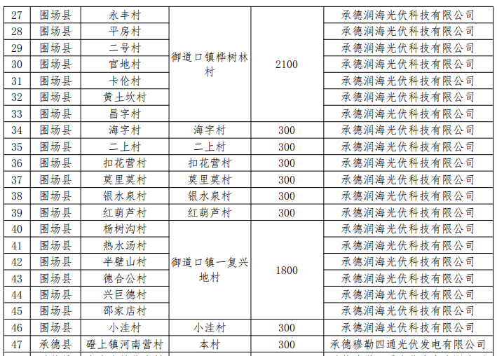 三、同意圍場(chǎng)縣村級(jí)光伏扶貧電站建設(shè)企業(yè)由圍場(chǎng)滿族蒙古族自治縣木蘭同創(chuàng)投資有限公司變更為承德潤(rùn)海光伏科技有限公司。同意楊家灣鄉(xiāng)興巨德村、楊家灣鄉(xiāng)邵家店村、三義永鄉(xiāng)德合公村、山灣子鄉(xiāng)楊樹溝村、山灣子鄉(xiāng)熱水湯村、山灣子鄉(xiāng)半壁山村采取6村聯(lián)建、分村備案的方式,建設(shè)地點(diǎn)變更為御道口鎮(zhèn)一復(fù)興地村,裝機(jī)規(guī)模1800千瓦;城子鄉(xiāng)平房村、城子鄉(xiāng)二號(hào)村、道壩子鄉(xiāng)永豐村、南山咀鄉(xiāng)官地村、南山咀鄉(xiāng)卡倫村、黃土坎鄉(xiāng)黃土坎村、黃土坎鄉(xiāng)昌字村采取7村聯(lián)建、分村備案的方式,建設(shè)地點(diǎn)變更為御道口鎮(zhèn)樺樹林村,裝機(jī)規(guī)模2100千瓦。