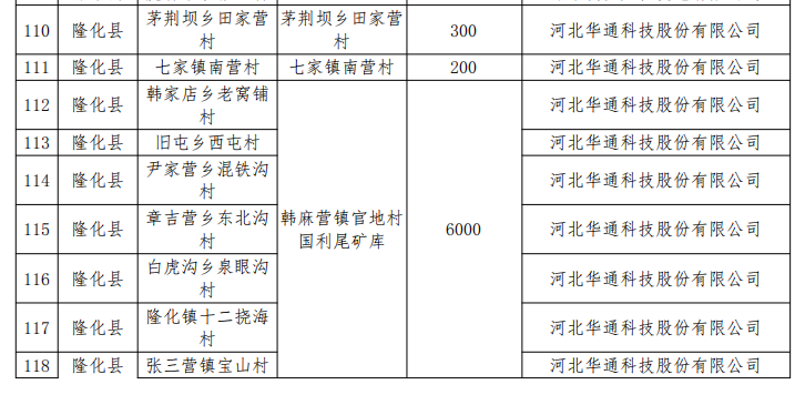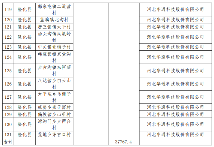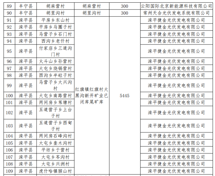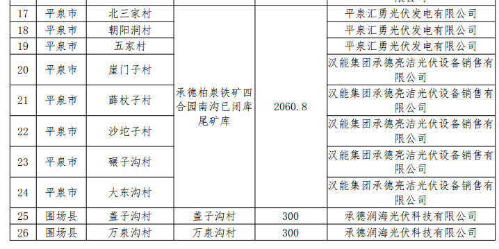 四、同意隆化縣村級(jí)光伏扶貧電站建設(shè)企業(yè)由河北華通科技股份有限公司和常州天合光伏發(fā)電系統(tǒng)有限公司變更為全部由河北華通科技股份有限公司1家企業(yè)建設(shè)。同意隆化鎮(zhèn)十二撓海村、張三營(yíng)鎮(zhèn)寶山村、郭家屯鎮(zhèn)二道營(yíng)村、藍(lán)旗鎮(zhèn)北溝村、唐三營(yíng)鎮(zhèn)太平村、湯頭溝鎮(zhèn)鳳凰嶺村、中關(guān)鎮(zhèn)北鋪?zhàn)哟濉㈨n麻營(yíng)鎮(zhèn)京堂溝村、步古溝鎮(zhèn)東阿超村、韓家店鄉(xiāng)老窩鋪村、舊屯鄉(xiāng)西屯村、尹家營(yíng)鄉(xiāng)混鐵溝村、章吉營(yíng)鄉(xiāng)東北溝村、白虎溝鄉(xiāng)泉眼溝村、八達(dá)營(yíng)鄉(xiāng)白云山村、太平莊鄉(xiāng)馬柵子村、堿房鄉(xiāng)燕子窩村、偏坡營(yíng)鄉(xiāng)山咀村、灣溝門鄉(xiāng)大西臺(tái)村、荒地鄉(xiāng)茅吉口村等20村聯(lián)建,分村備案,建設(shè)地點(diǎn)變更為韓麻營(yíng)鎮(zhèn)官地村國(guó)利尾礦庫,裝機(jī)規(guī)模6000千瓦。