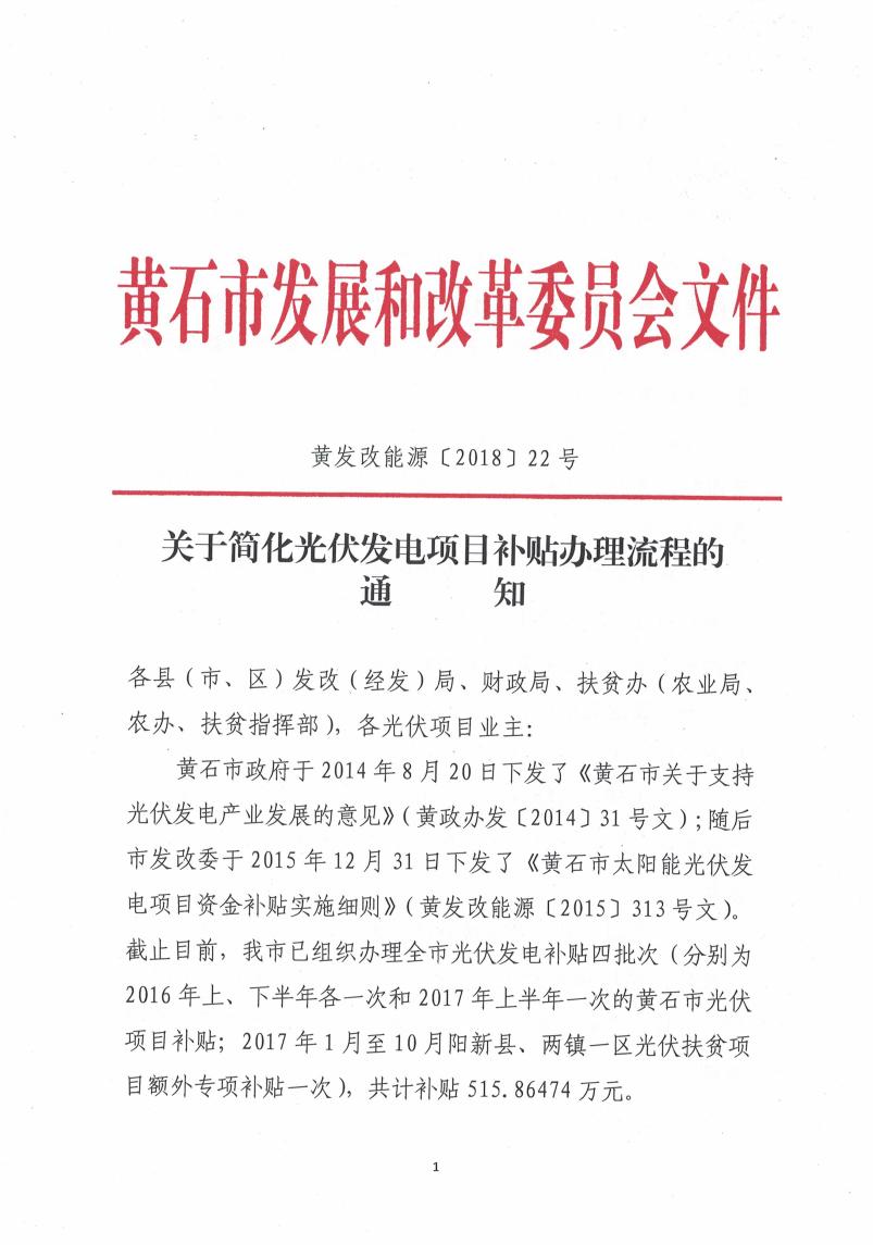 近日,湖北黃石發(fā)改委下發(fā)《關(guān)于簡化光伏發(fā)電項目補(bǔ)貼辦理流程的通知》。通知指出,為減少審核環(huán)節(jié),縮短辦理時限,方便業(yè)主盡快拿到光伏補(bǔ)貼,按照屬地原則,自2018年1月1日起,黃石市內(nèi)所有光伏項目補(bǔ)貼資金辦理流程將進(jìn)行簡化。
