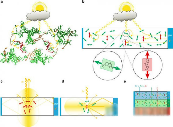 但這一新型聚光器由一種隨機(jī)取向的顏料構(gòu)成,幾乎可以從任何入射角度吸收光線,并將其映射在面向單一方向的組件上。在聚光過(guò)程中只有10%的損失。而實(shí)驗(yàn)表明,這一聚光器能吸收入射光的99%左右,光重定向量子效率大于80%。