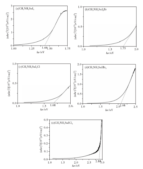 圖4是不同成分的鈣鈦礦薄膜的的關(guān)系曲線。由圖4(a)可見,CH3NH3SnI3成分的薄膜禁帶寬度最小,為1.44eV。摻雜部分Br-與Cl-后,如圖4(b)、(c)所示,CH3NH3SnI2Br和CH3NH3SnI2Cl鈣鈦礦薄膜的禁帶寬度增大,分別為1.75eV和1.68eV,這是由于Br-與Cl-的引入導(dǎo)致鈣鈦礦結(jié)構(gòu)的晶格變小,并且電離度增加,從而導(dǎo)致帶隙變寬。而當Br-與Cl-的摻雜量增多,如圖4(d)、(e)所示,CH3NH3SnIBr2和CH3NH3SnICl2鈣鈦礦薄膜的禁帶寬度進一步增大,分別為2.08eV和2.88eV圖4 不同成分的鈣鈦礦薄膜的的關(guān)系曲線圖