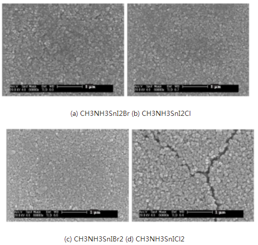 圖1是不同成分的鈣鈦礦薄膜的SEM形貌圖,4種成分的鈣鈦礦薄膜均是在100℃下經(jīng)過5min退火而得到。與CH3NH3SnI3薄膜SEM圖(見圖1)相比,Br-與Cl-引入過多時,過多的Br-與Cl-可能在結(jié)晶的過程中產(chǎn)生某種中間產(chǎn)物,從而減慢了鈣鈦礦的結(jié)晶速率,并且由于Br-、Cl-與I-存在較大的原子尺寸差別,從而導(dǎo)致晶格發(fā)生畸變,結(jié)晶過程也會延長,退火處理的時間也需要相應(yīng)延長。所以退火溫度為100℃時,在相對較短的5min退火時間內(nèi),如圖1(c)所示,CH3NH3SnIBr2薄膜的晶粒大小不均一。而圖1(d)中,由于退火時間較短,CH3NH3SnICl2薄膜的晶粒較粗大,且薄膜表面不夠平整和致密。圖6(d)薄膜上面出現(xiàn)大裂紋是由測SEM時的高電壓所導(dǎo)致的薄膜開裂。