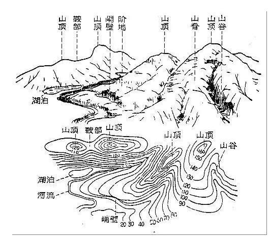 6、緩坡與陡坡:等高線越密集處,地形越陡峭;等高線越稀疏處,坡度越舒緩。