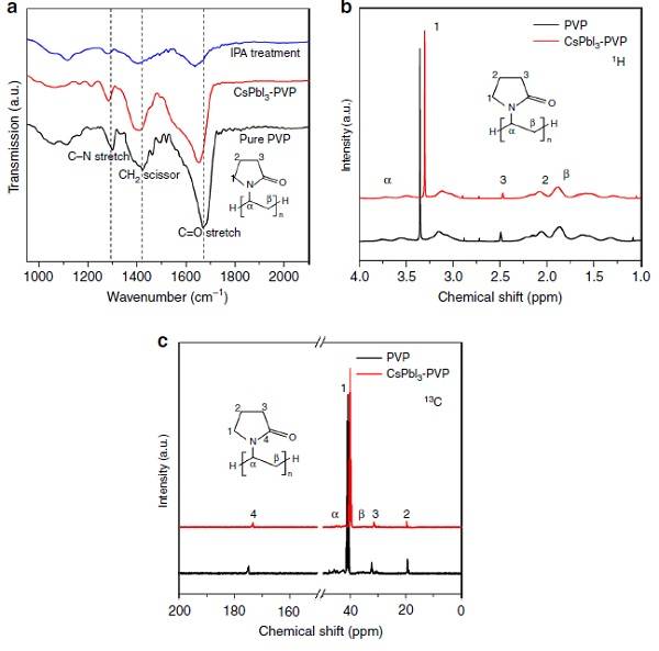 (b, c). PVP以及碘化銫鉛-PVP的1H和13C的核磁共振譜。