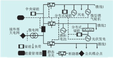 圖2是微電網(wǎng)的一種典型的結(jié)構(gòu)圖。由圖2可以看出,微電網(wǎng)由微電源、負(fù)荷、儲(chǔ)能以及能量管理器等組成。儲(chǔ)能在微電網(wǎng)中發(fā)生作用的形式有:接在微電源的直流母線上、包含重要負(fù)荷的饋線上或者微電網(wǎng)的交流母線上。其中,前兩種可稱為分布式儲(chǔ)能,最后一種叫做中央儲(chǔ)能。