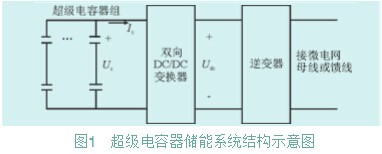 在超級(jí)電容器組充放電過程中,端電壓范圍變化大,通常必須采用DC/DC變換器作為接口電路來調(diào)節(jié)超級(jí)電容器的儲(chǔ)能和釋能。DC/AC變換器可采用雙向DC/AC逆變器,或者采用AC/DC整流器及DC/AC逆變器。超級(jí)電容器儲(chǔ)能系統(tǒng)并聯(lián)在微電網(wǎng)中母線或者饋線上。