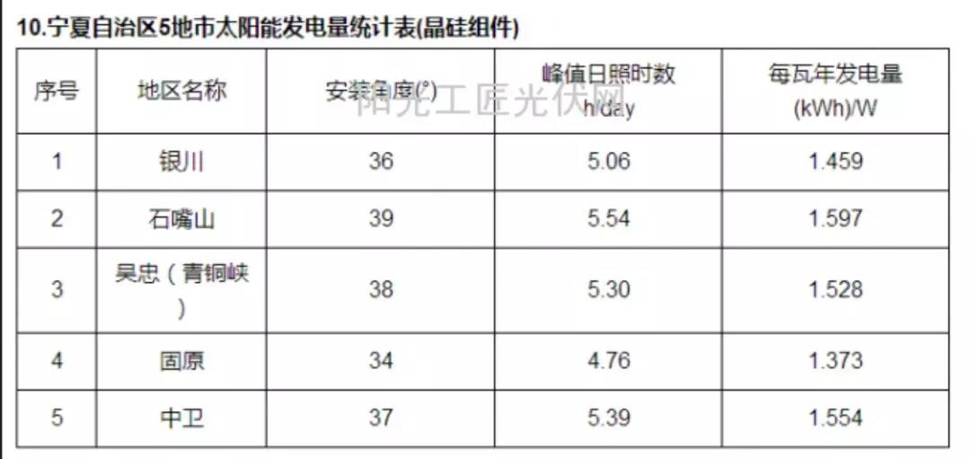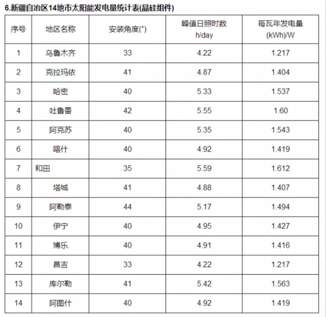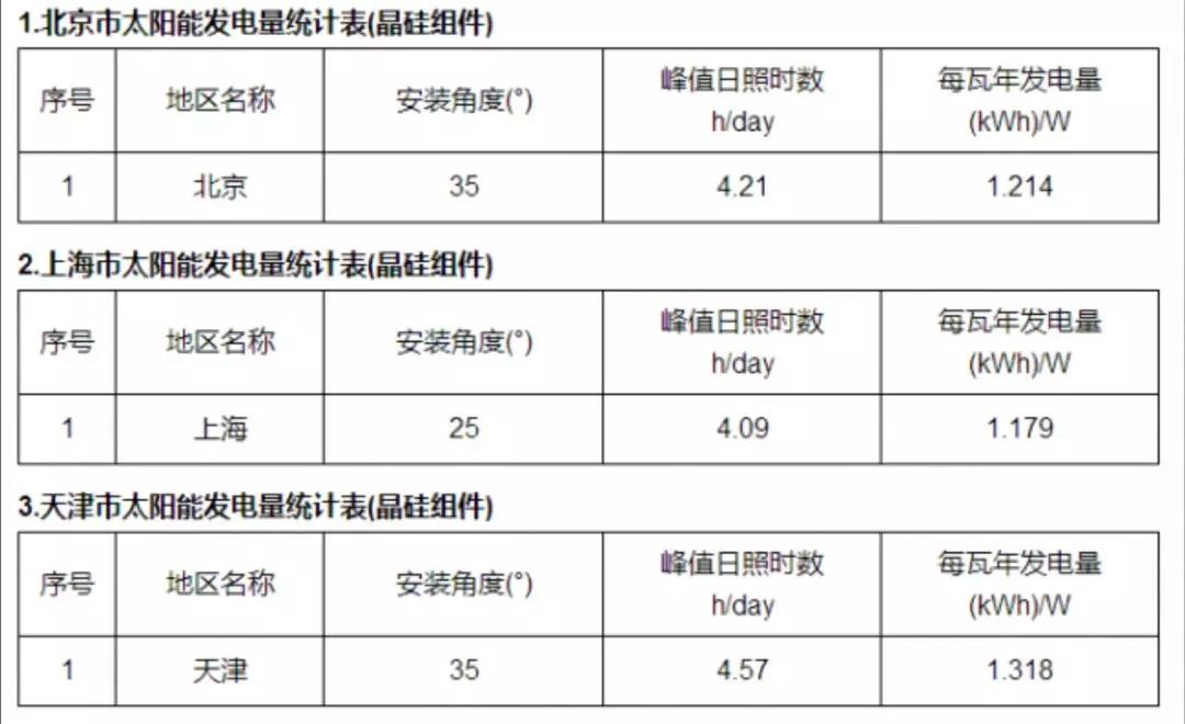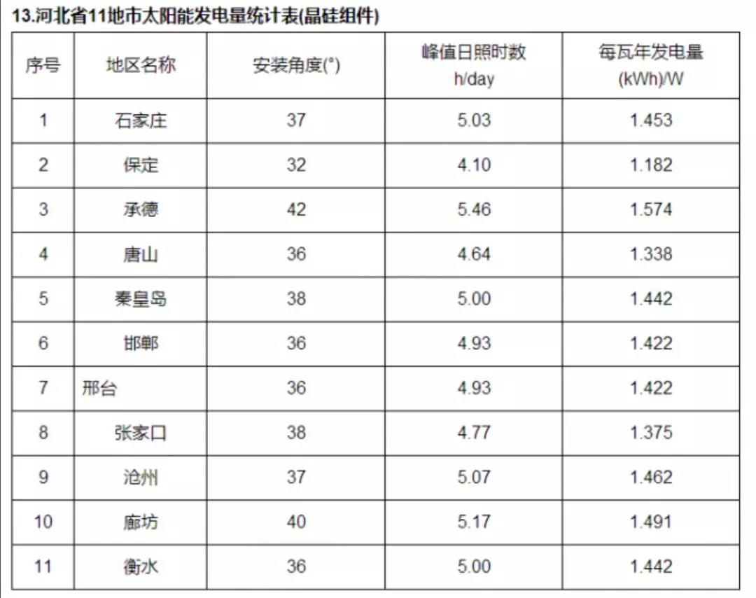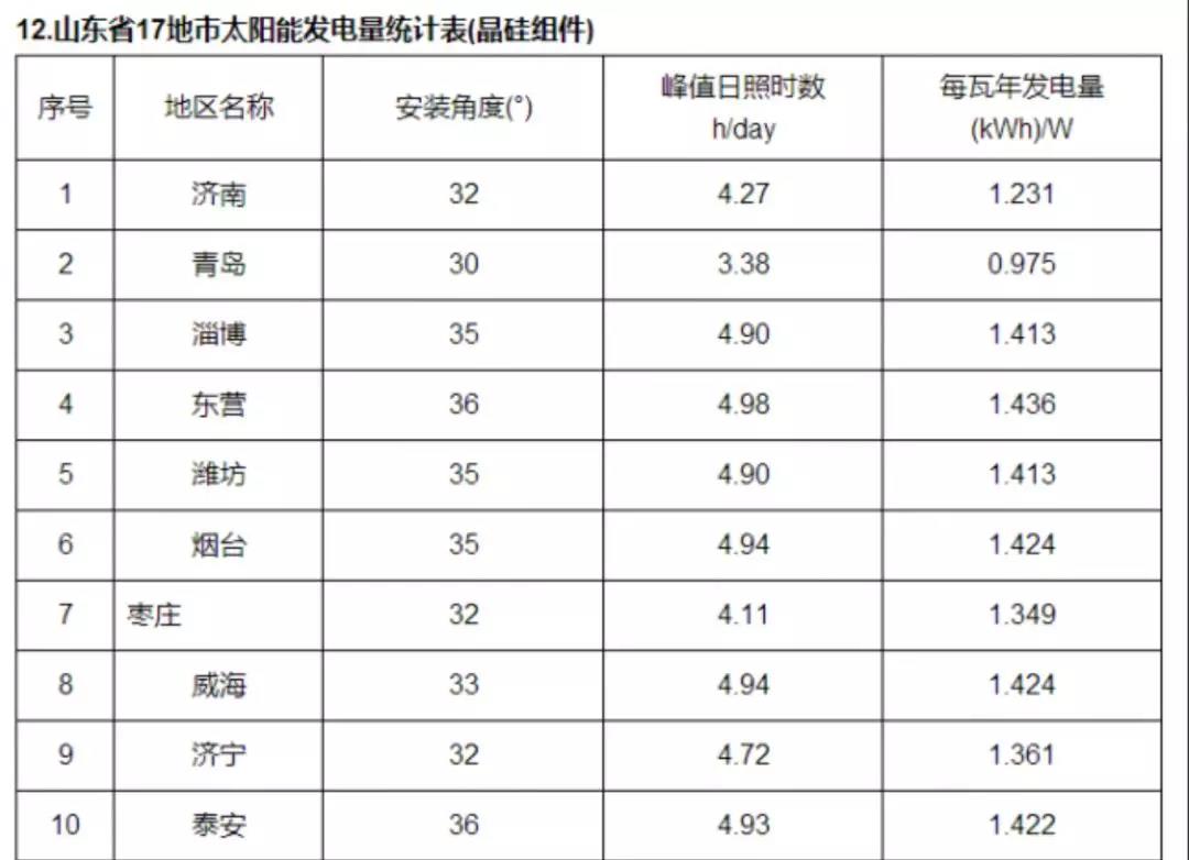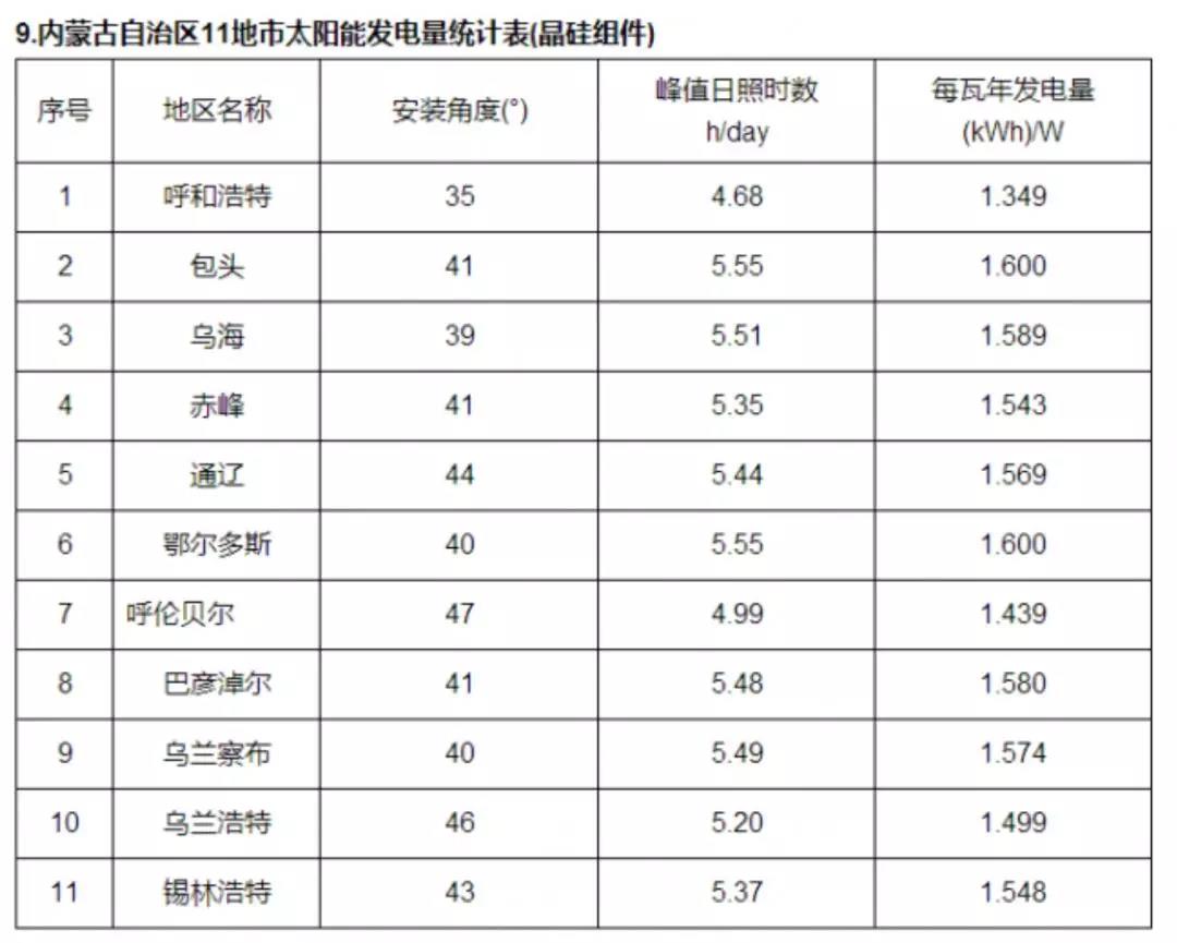 附:全國地面光伏電站最佳安裝角度及發(fā)電量速查表