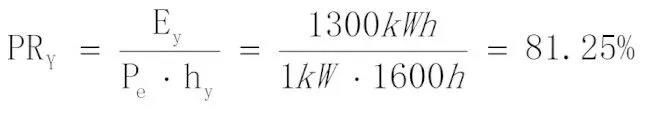 以我們最容易理解的年均PR來說,如果方陣面上接收到的年總輻射量是1600kWh/㎡,那就是說方陣面上的峰值日照時數(shù)是1600h;如果計量電度表記錄的年發(fā)電量是1300kWh/kW;那么年PR就是: