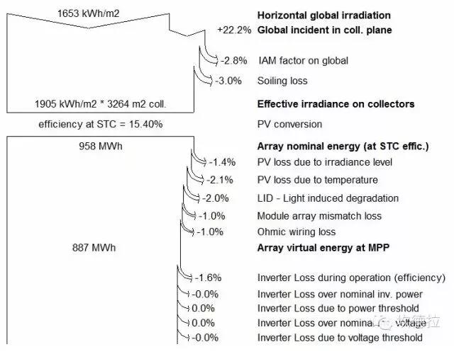 上述PR的定義實際是個黑盒子,只看輸入-輸出,實際PR的組成是隨著能量從太陽能轉(zhuǎn)為最后計量電度表的電能一步步的變化的,包括遠方遮擋損失、近處遮擋損失、弱光損失、溫度損失、不匹配損失、線損、污穢損失、停機損失等等,需要利用專業(yè)軟件PVsyst進行分析。一個典型的分析結(jié)果如下: