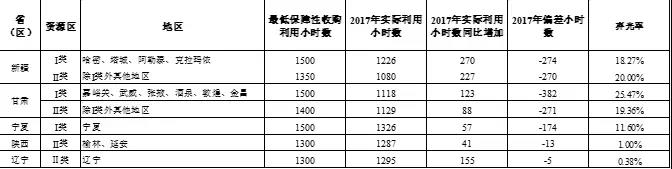 自2016年提出全額保障性收購相關要求,到2017年,內(nèi)蒙古、青海、黑龍江、吉林、山西II類地區(qū)、河北II類地區(qū)達到光伏發(fā)電最低保障收購年利用小時數(shù)要求;甘肅I類和II類地區(qū)、新疆I類和II類地區(qū)、寧夏、陜西II類地區(qū)、遼寧五個省(區(qū))未達到要求,下表為具體最低保障收購年利用小時數(shù)偏差數(shù)值及棄光率。