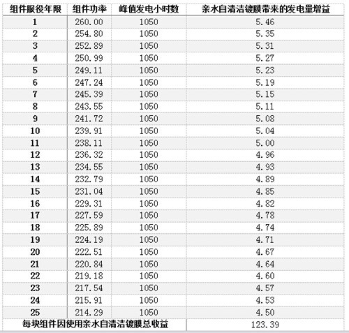 作為親水自清潔鍍膜技術(shù)的領(lǐng)先者,3M親水鍍膜技術(shù)已有超過7年的戶外實際使用經(jīng)驗。按照相同功率條件下,親水鍍膜2%的功率增益,組件功率第一年的功率衰減為2%,以后每年的功率衰減為0.75%計,每塊使用親水鍍膜的組件25年的服役周期內(nèi)帶來的總的經(jīng)濟效益參見下表。